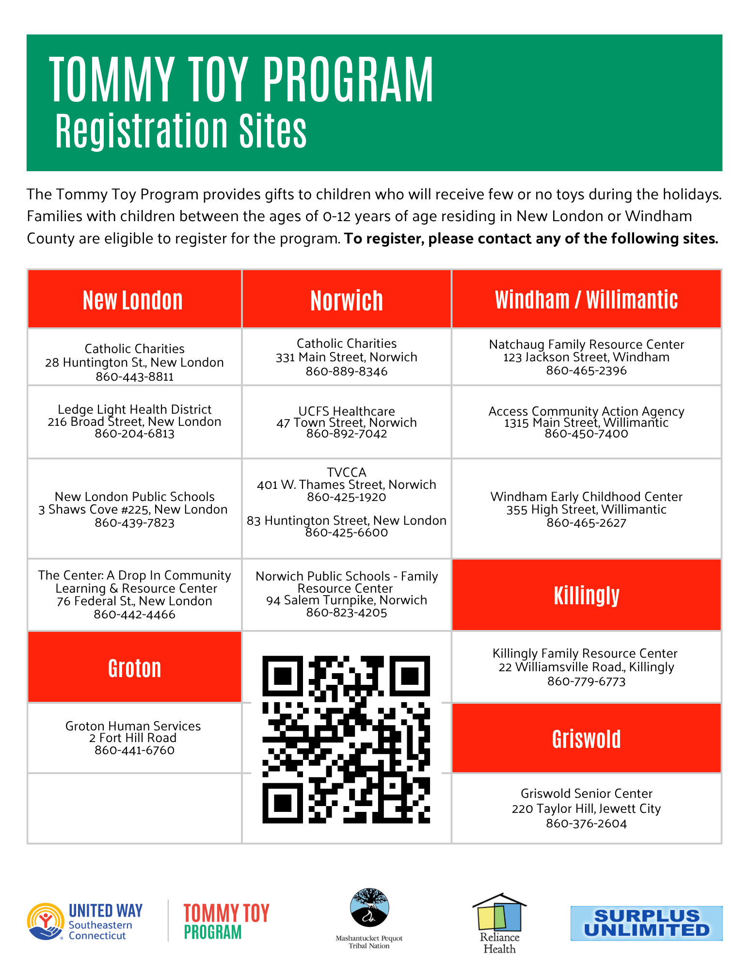 Families can register through approved registration sites listed below. Tommy Toy is for with children between the ages of 0-12 years of age residing in New London or Windham County.